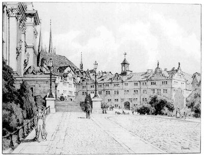 − | [[Bild: Fennel Marställer Platz.jpg|thumb|400px|left|'''Am Marställer Platz.''' Lithographie von Friedrich Fennel um 1905.]]<br /> | + | [[Bild: Fennel Marställer Platz.jpg|thumb|400px|left|'''Am Marställer Platz.''' Lithographie von Friedrich Fennel um 1905.<br /> |