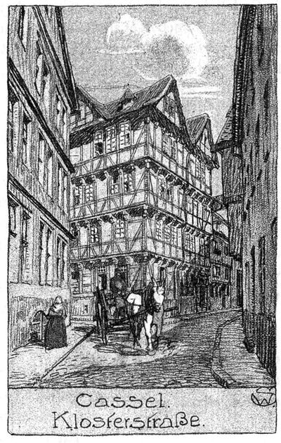 [[Bild: Schwabe Klosterstraße.jpg|thumb|400px|right|'''Cassel. Klosterstraße.''' Von [[Walter Schwabe]] (ca. 1905/12).<br /> | [[Bild: Schwabe Klosterstraße.jpg|thumb|400px|right|'''Cassel. Klosterstraße.''' Von [[Walter Schwabe]] (ca. 1905/12).<br /> | ||