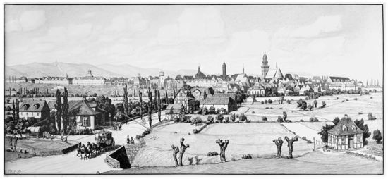 [[Bild: Metzarchiv KS Bied Leipziger Tor 1830.jpg|thumb|550px|right|'''Vor dem Leipziger Tor 1830.''' Lavierte Federzeichnung von [[Ernst Metz]] 1927. -- Archiv Harald Metz, Bickenbach.]]