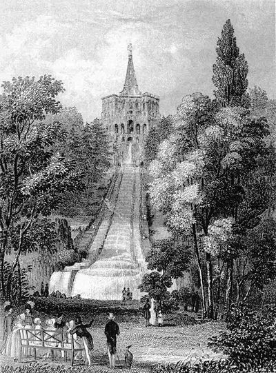 + | [[Bild: Wenderoth Herkules.jpg|thumb|400px|left|'''Das Riesenschloß und die Kascaden.''' Stich v. Payne nach Zeichnung v. Wenderoth. --''Kurfürstenthum Hessen'' (1858, Nachdr. 1973), S. 66.]] | ||