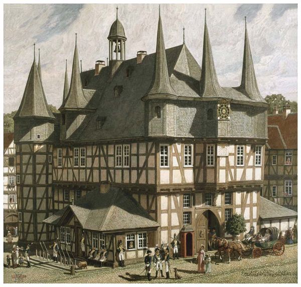 Das Rathaus zu Frankenberg 1800. Gemälde von Ernst Metz 1964. -- Archiv Harald Metz, Bickenbach.