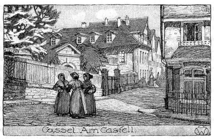 + | [[Bild: Schwabe Kastell.jpg|thumb|700px|center|'''Cassel. Am Castell.''' Von Walter Schwabe (ca. 1905/12).<br /> | ||