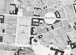 Der Königsplatz wurde nach Schleifung der Kasseler Festungswerke nach Plänen von Simon Louis du Ry 1768 „als Schaltstück zwischen der Kasseler Altstadt und neuen Bebauungsgebieten“[1]angelegt. Das „Neue Thor“ in der bisherigen Befestigung wurde in die auf den Platz „einmündende Kölnische Straße hinausgerückt und nun ,Cölnisches Thor‘ genannt [...]. – Der kreisrunde Platz führte, wie die ihn durchschneidende Straße, seinen Namen nach Landgraf Friedrich I. (1676 – 1751), dem älteren Sohn und Nachfolger des Landgrafen Carl, der durch seine zweite Heirat mit Ulrike Eleonore König von Schweden geworden war. [...] Eine gewisse Merkwürdigkeit bildete der Mittelpunkt des Platzes, von dem aus man ,bei Abendstille‘ ein Echo mit sechsfachem Hall, das sich manchmal gar zu einem ,Heptophon‘ (siebenstimmigen) auswuchs, hören konnte. […] – Eine weitere Eigentümlichkeit dieses schönen, kreisrunden Platzes war die aus sämtlichen in Hessen vorkommenden Gesteinsarten bestehende verschiedenartige Pflasterung, die, in Form und Farbe entsprechend zusammengestellt, in der Peripherie unterschiedliche Ringe, im Innern aber ein gemustertes Mittelstück aufwies. Sie verschwand bei der Gleisanlage der ,Tramway-Bahn‘ (später ,Casseler Straßenbahn‘) im Jahre 1878.“[2]