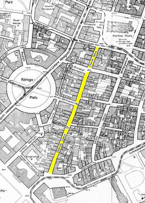 + | [[Bild: Oberste Gasse.jpg|thumb|500px|right|'''Altstadt (Ausschnitt), Stand: 1943.'''<br />Aus: Brier/Dettmar: Kassel, Veränderungen I, 1986, S. 17.]] | ||