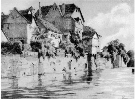 + | [[Bild: Metzarchiv AC Rechtes Fuldaufer.jpg|thumb|450px|right|'''Rechtes Fuldaufer, mit Brückenhaus.''' Federzeichnung von [[Ernst Metz]] 1921. -- E. Metz, ''Alt-Cassel'' (1922), hier: Archiv Harald Metz, Bickenbach.]] | ||