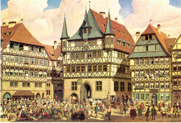 [[Bild: Metz Rathaus Altmarkt.jpg|thumb|700px|left|'''Der Marktplatz mit dem Rathaus und der Fleischschirne 1785.''' Gemälde von [[Ernst Metz]], entstanden 1953 (historische Rekonstruktion).<br />