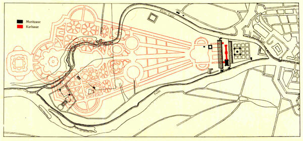 Die Parkgestaltung zwischen den beiden Fuldaarmen zur Zeit des Landgrafen Moritz und des Landgrafen Karl: Moritzaue und Karlsaue. -- Paul Heidelbach, Kassel (1957), S. 137.