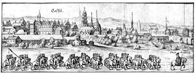 + | [[Bild:Merian Kassel 1638.jpg|thumb|400px|right|'''Cassel, 1638.''' Kupferstich von Matthäus Merian nach Zeichnung von August Erich in ''Monumentum sepulcrale ... Mauritii ...''. 1638. -- F. Lometsch (Hrsg.), ''Kassel in alten Bildern'' (1966), S. 21.]] | ||