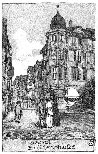 [[Bild: Schwabe Brüderstraße.jpg|thumb|400px|left|'''Cassel. Brüderstraße.''' Von Walter Schwabe (ca. 1905/12).<br/> | [[Bild: Schwabe Brüderstraße.jpg|thumb|400px|left|'''Cassel. Brüderstraße.''' Von Walter Schwabe (ca. 1905/12).<br/> | ||