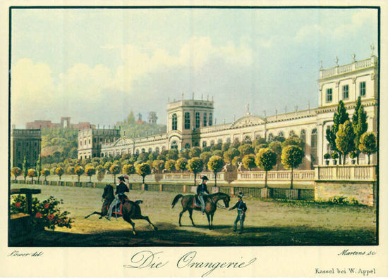Karlsaue mit Orangerie und Blick auf die Oberneustadt, 1789. Kolorierter Stich von Johann Werner Kobold (1740 - 1803). -- Paul Heidelbach, Kassel (1957), S. 145.