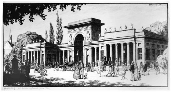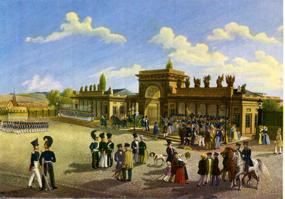 Wachablösung vor dem Auetor am Friedrichsplatz, 1843. Ölgemälde von Franz Tonnelier. -- P. Heidelbach, Kassel (1957), S. 197.
