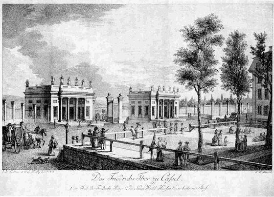 Das Friedrichs-Thor zu Cassel, 1783. Stich von Gotthelf Wilhelm Weise nach Zeichnungen von H. Tischbein und S. L. DuRy. -- P. Heidelbach, Kassel (1957), S. 127.