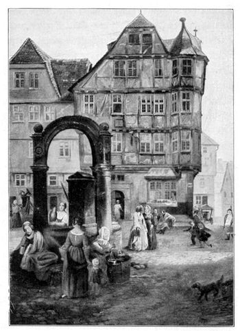 "Reizvolle Fachwerkbauten mit vorkragenden Stockwerken und hohen Giebeln, den für Kassel charakteristischen Eckerkern mit ihren geschwungenen Hauben, mit schönen Haustoren, mit Wetterfahnen, Wirtshausschildern und Zunftzeichen rahmten den nur kleinen Platz, auf dem immer reges Leben pulsierte. Sein schönster Schmuck war der originelle Brunnen an der Mündung von Graben und Pferdemarkt. Er wurde im Jahre 1567 an der Stelle eines älteren Brunnens errichtet, der schon den alten 'Anger' geschmückt hatte, als dieses Gelände noch außerhalb der Stadt lag[1] (vor Anlage der 'Freiheit' ab 1330). Den Brunnen schuf der Steinmetz und Architekt Nikolaus Jacob Bollinger, der nach seiner Heimatstadt auch Nikolaus von Ulm genannt wurde.[2] [...] Den Brunnen umstanden drei toscanische Säulen. Sie trugen Bögen, auf deren Scheitel ursprünglich eine Figur stand. Der Brunnen hatte schon 1896 dem Verkehr weichen müssen [...]."[3]