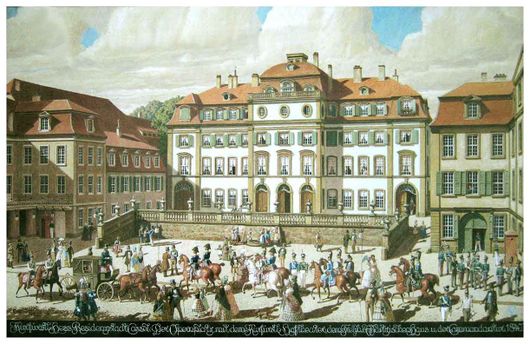 Das Haus rechts neben dem Waitzschen Palais, das Eckhaus Obere Königsstraße / Opernplatz wurde 1772 – 1774 „von dem hugenottischen Großkaufmann Roux erbaut. 1804 wird als Eigentümer ein Oberst von Roux genannt – und um 1813 dessen Erben. 1837 wurde das Gebäude vom Staat angekauft und zur Kommandantur bestimmt.“[7]