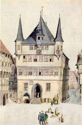 - ↑ „Erleuchtet wurde der Ratssaal von zwei sechsarmigen metallenen kunstvollen Kronleuchtern, deren Arme 1764 von der Frau eines Stadtdieners, die wohl die Räume zu reinigen hatte, entwendet und zu Geld gemacht wurden.“ (Metz, S. 86)