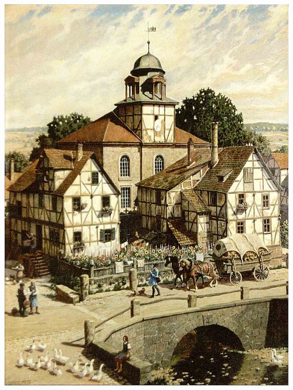 Küchen, Blick über die Brücke auf Häuser und Kirche. Gemälde von Ernst Metz. -- Archiv Harald Metz, Bickenbach.