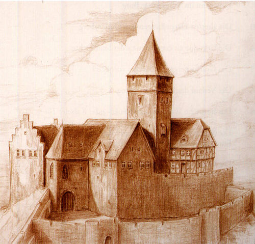„Beginnen wir oben an der Burg in Richtung alter Friedhof [d.h, nach links unten]. Am steilen Hang des Schloßberges standen zwei Halbschalentürme: der Schüler und der Zeller. Es folgte das Obertor und weiter abwärts der Schrendeisenturm. Die Mauer führte weiter zum Neuen- oder Kasseler Tor, das sich auf Höhe der Untergasse befand. Im weiteren Verlauf bildete der Ankenturm die linke untere Ecke der Stadtmauer. Nach dem Leilachen folgte das Freiheiter Tor und danach der Teichturm, der an der Ecke der unteren Mauer stand. Es folgte das Niedertor am Ausgang der Untergasse, hangaufwärts zur Wenigenburg der Weißenturm und danach der letzte, heute noch erhaltene Wachturm, der Gefangenenturm. Weiter bergaufwärts stand der Sanner und – kurz bevor die Stadtmauer im Bereich der Burg in die Zwingmauer überging – ein Halbschalenturm ohne überlieferten Namen.“[1]