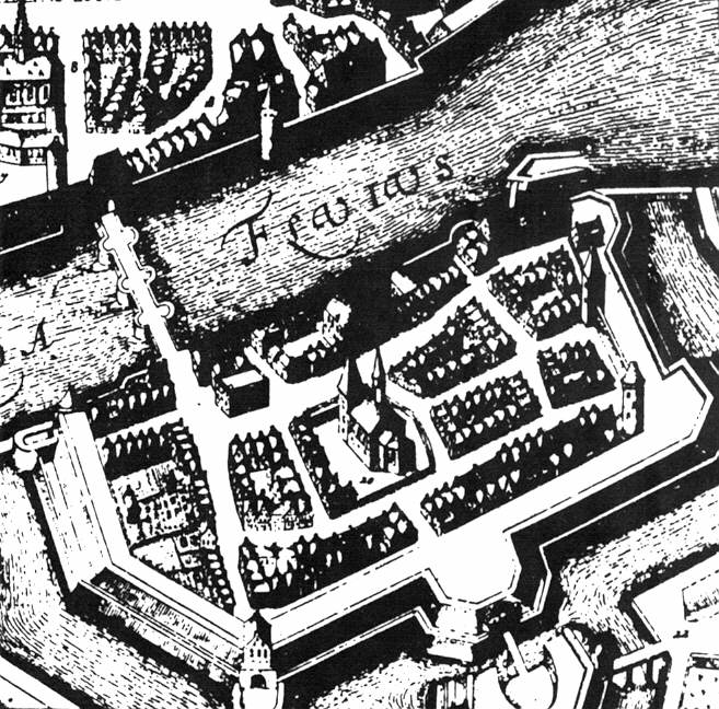 Kasseler Unterneustadt, Ausschnitt aus Merian-Plan 1646. -- W. Hermsdorff, Fuldafluten, Blick zurück Nr. 1392, HNA v. 18.7.1992.