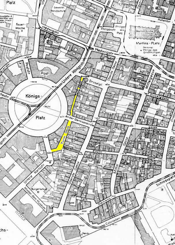 Turmgasse Kassel 1943. Aus: Brier/Dettmar: Kassel, Veränderungen I, 1986, S. 17.