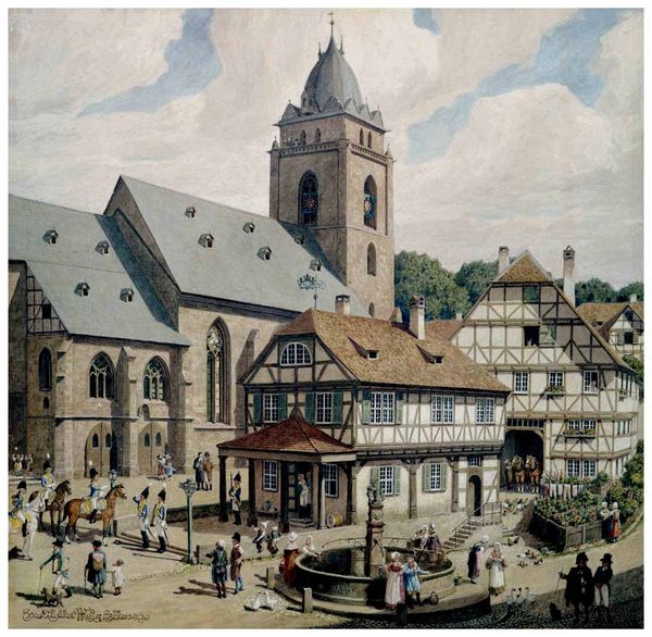 Stadtkirche mit Hauptwache und Marktbrunnen um 1802.